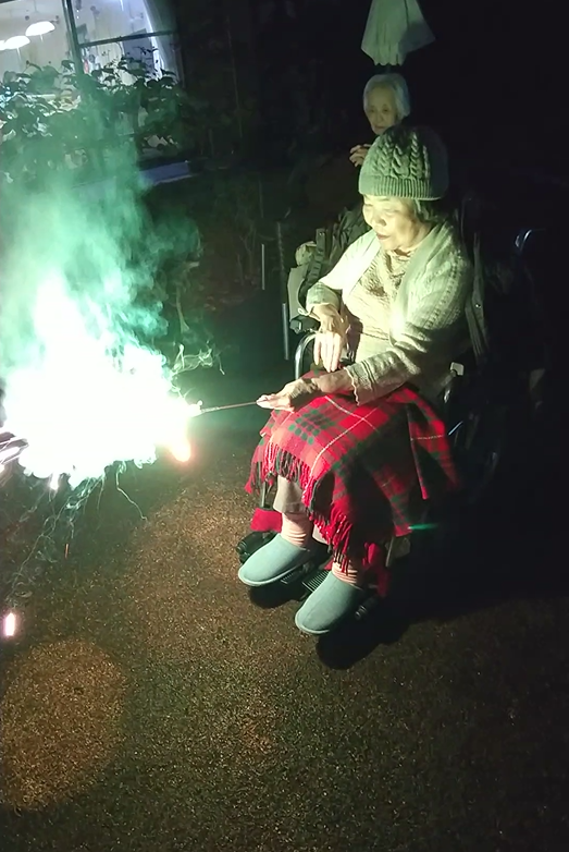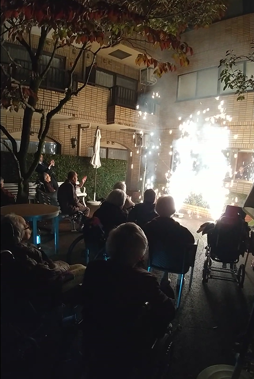 花火大会当日、夕食後に入居者の皆さんには中庭に集まって頂き、まずは6種類の花火を順に点火✨