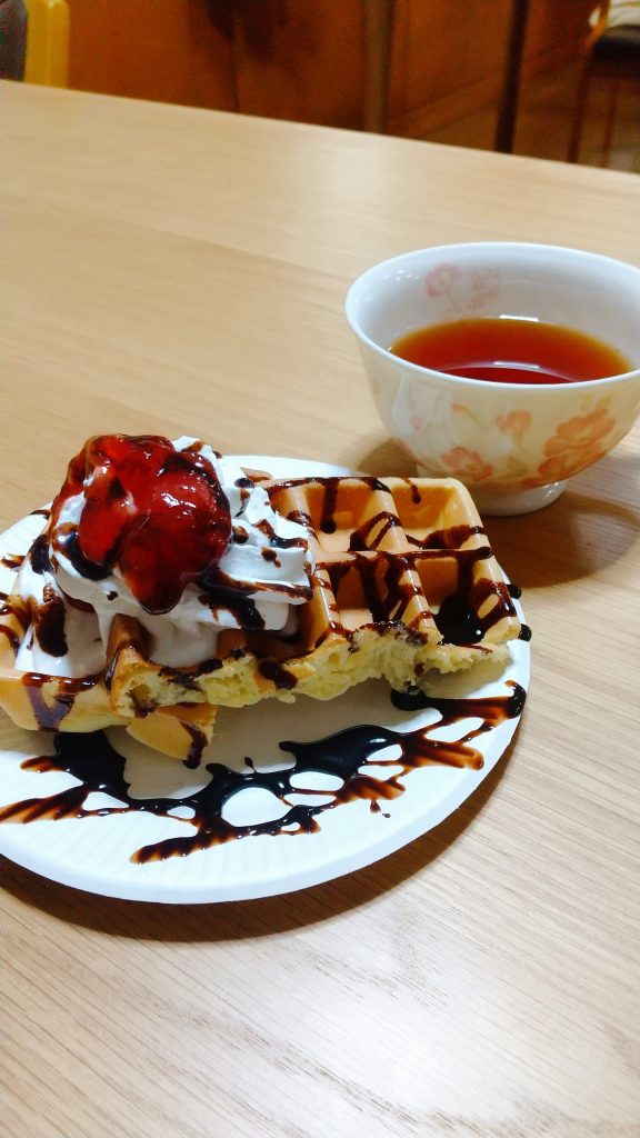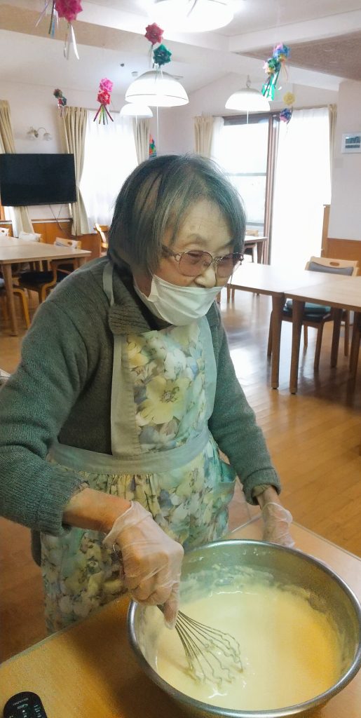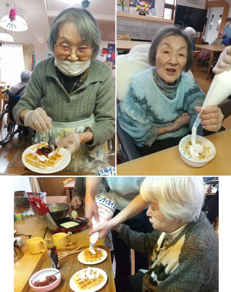 今回は、ワッフルの種作りから専用ホットプレートでの焼き作業、トッピング作業に至るまで、全て入居者様に行って頂きました🤗